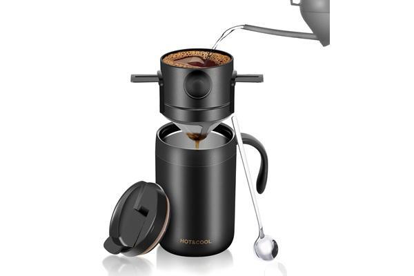 【不鏽鋼手沖濾掛咖啡保溫杯】顏色:黑色/材質:杯身內膽304不鏽鋼、PP、201不鏽鋼湯勺/尺寸:約12.5*9.5*16.5cm/重量:約400g/容量:500ml/包裝:紙盒。