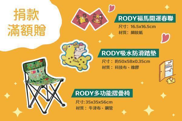 ◆捐款單筆6,600元以上或每月550元(一年以上),贈【RODY吸水防滑踏墊+RODY多功能摺疊椅】乙組。
